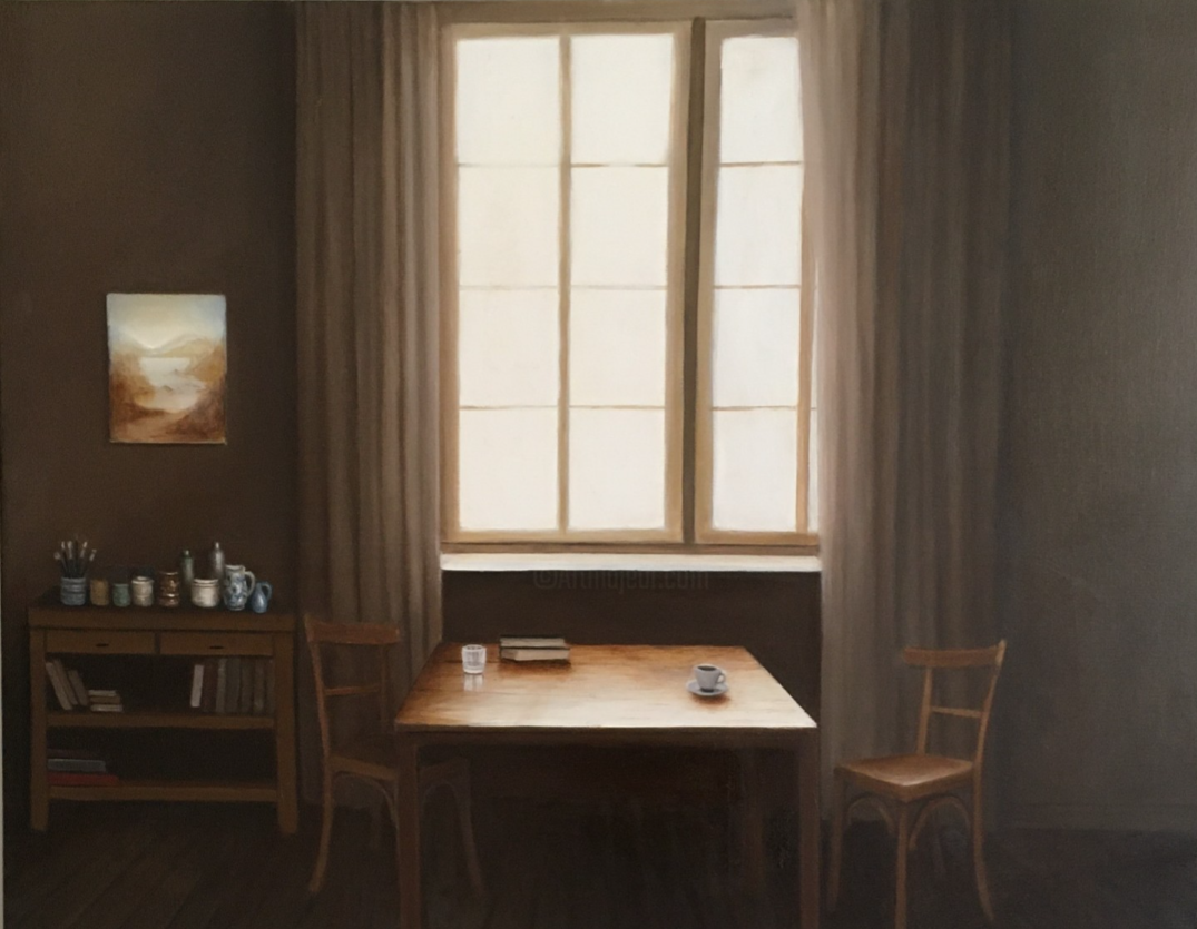 Serait-ce alors que nous serions entrés dans le velouté de la toile alors qu’il n’y a personne ? Oui, notre esprit aux deux sens du terme, assurément – la peinture nous faisant disparaître à nous-mêmes pour nous projeter dans un ailleurs intime que nous ignorions. La géométrie angulaire des œuvres de cette toute récente manière de l’artiste laisse une infinité de coins où tapir son œil : à l’angle d’une fenêtre, d’une porte, d’un seuil, d’une étagère, d’un mur, d’un escalier, d’une marche, d’un carreau, d’un tiroir, d’une chaise, d’un lit, d’un miroir, d’une table, d’un fauteuil, d’un coussin, d’un cadre accroché que l’on reconnait être de l’artiste – l’espace intérieur se dupliquant en abyme comme pour trouver, au sein du silence et de l’apaisement, une issue à la fois centripète etcentrifuge. Des présences hantent ces toiles, que l’on sent fin prêtes à d’imperceptibles mouvements de l’âme. Des entrebâillements, des fenêtres, des livres, des perspectives ouvrent sur un ailleurs extérieur, celui d’une végétation, d’une rivière, d’un chemin, d’une mer, d’une grève confondue avec un ciel vaporeux d’où l’on se dit que Joëlle Possémé a extrait ses pigments ou ses huiles ! Le huis-clos de ces appartements peints à l’huile selon la technique des glacis superposés, contient des réserves de paix infinie, minutieusement contraintes dans cette transparence, et dont la peintre ouvreprogressivement grand les vannes pour une respiration universelle. Il contient par contraste des plissés aussi blancs que des linceuls abandonnés sur une porte, un lit, un dossier, preuves flottantes d’une vie récente, vaines dépouilles, mues dont la clarté souligne un souvenir de ténèbres caché parmi les tons pastels qui vont du gris perle au chamois. Ces pages, ces serviettes, ces draps immaculés agissent dans le regard comme des promesses d’autres toiles à venir, pas encore tendues.Mais elles sont déjà là, vibrantes, dans son atelier de la rue Trousseau, à Paris, sans plus aucun cadre, aucune contention.